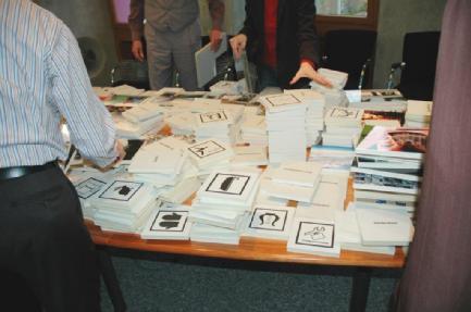 Ein weiterer Teil der Ausstellung basiert auf einem Workshop, welchen die REINIGUNGSGESELLSCHAFT mit neun Mitarbeiterinnen und Mitarbeitern der B.Braun Melsungen AG durchführte. Die Teilnehmer entstammen verschiedenen Hierarchieebenen des Betriebes. Mittels eines Visualisierungsprozesses, der auf der Verwendung von Fotografien und Symbolen basiert, wurden Wertevorstellungen in Begriffsform bestimmt. In der Ausstellung sind 45 Bildmodule zu sehen, die als Ergebnis des Workshops entstanden sind.
