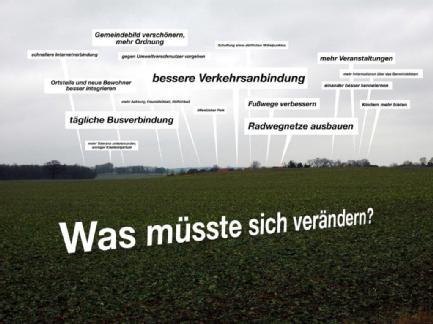 Zu Beginn der Projektlaufzeit lernte RG bei Gesprächen und Rundgängen durch das Dorf die Besonderheiten des ländlichen Raums kennen. Neben der Auseinandersetzung mit dem Naturraum und der regionalen Geschichte waren die Lebensbedingungen und existenziellen Schwierigkeiten im Dorf im Zentrum des Interesses. Dabei war es wichtig, engagierte Menschen und Initiativen aufzusuchen. Es fiel auf, dass zwischen alteingesessenen und neuen Dorfbewohnern kaum persönliche Verbindungen bestanden. Dies hängt mit fehlenden Arbeitsmöglichkeiten im Dorf zusammen, was eine hohe Pendlermobilität zur Folge hat. Durch die technischen Entwicklungen in der Landwirtschaft werden heute in der Region kaum noch Arbeitsplätze benötigt. Das Dorf verändert sich und mit ihm das Spannungsverhältnis zwischen ländlichem und urbanem Raum. Die Neusiedlung, deren Einfamilienhäuser seit 1990 durch eine staatliche Eigenheimzulage bis 2004/05 gefördert wurden, glich bei Projektbeginn einer Vorstadtsiedlung mit klein parzellierten Grundstücken. Neben den Eigenheimen nahmen Garagen und Carports, wo meist mehrere Fahrzeuge parkten, viel Platz ein. Ein eigenes Fahrzeug für fast jedes Familienmitglied wurde zur wichtigstenÜberlebensgrundlage. Der öffentliche Nahverkehr verband den Ort mit der Außenwelt nur an wenigen Tagen der Woche. Weiterhin gab es keine Einkaufsmöglichkeiten im Ort. Der nächste Supermarkt befand sich im Nachbardorf. Die Grundversorgung mit Lebensmitteln und Dienstleistungen, wie Ärzten, Schulen und Kultureinrichtungen, wurde zur infrastrukturellen Herausforderung. Das Internet befand sich 2009 noch im DFÜ-Zeitalter (Datenfernübertragung, ein Übermittlungsprotokoll, das in den 1980er Jahren entwickelt wurde). Diese Faktoren boten schlechte Vorraussetzungen, um junge Menschen an das Dorf zu binden oder für ein Leben auf dem Land zu gewinnen.