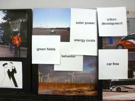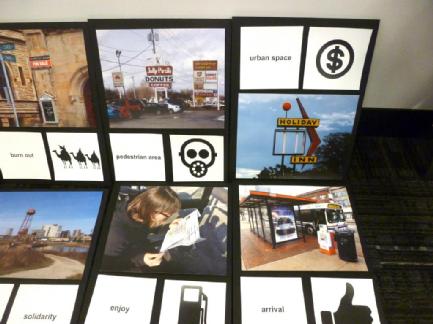As a result a holistically oriented workshop took place. The workshop brought together representatives from different fields, for example COTA employees, representatives of the Afro-American and Hispanic minorities, the Humanity Department of the Ohio State University, the Columbus College of Art and Design, the municipality and bike initiatives. The objective of the participative workshop was to identify indicators for a sustainable development. The workshop was divided into three parts. In part one the participants were asked to combine photographs taken during our bus rides with pictograms and key words from statements of the municipality, city institutions and the organisations and initiatives we had invited for the workshop. The participants assembled their personal combinations of these three modules in order to visualize their viewpoints and analyses of the city.