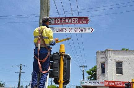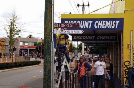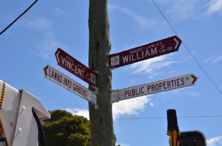 RG proposes a FUTURE AGENDA as an outcome of a cognitive mapping in the form of street signs on cross roads in the five boroughs of Vincent. The existing street signs represent the colonial past including historic settler's names, geographic places of European descent and only a very small number of indigenous references. RG refers to the semiotic significance of the signs for the urban identity in the public intervention. The new street names present community visions and issues.