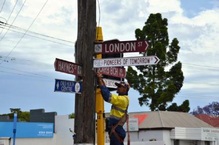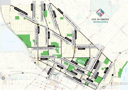 Initially RG analysed the City from different perspectives, holding three dialogue sessions on the topics of Migration, the Aboriginal Perspective plus Housing and Economy. RG also met with individuals, representatives from the ethnic and religious communities, and advisors from the City of Vincent. RG researched and compiled information from reports, statistics and articles. The different STORYLINES that were accumulated represent challenges of community life in the present and future. The cognition was transformed into a public display of street name signs in order to raise a critical consciousness for changes in the future and to open a public dialogue to anticipate an integrated community life.