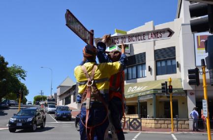 Urban Storylines During the project there were created new street names for twenty three streets of the City of Vincent in the greater Perth area in Western Australia. In a participatory process with local inhabitants there were identified themes and topics concerning urban change and sustainable life. REINIGUNGSGESELLSCHAFT helped the community to express their aspirations and critique and created the new street names that appear at the main intersections. The artists have held public dialogue sessions and collected information on current social and economic developments. They listened to the storylines of urban dwellers and collected their narratives. The knowledge was transformed then into a future agenda for the citizens that appears in public space in the form of new street name signs.