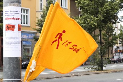 Am 20. Juli 2014 führten Martin Keil und Henrik Mayer von der Projektgruppe REINIGUNGSGESELLSCHAFT den ersten Teil der Performance im öffentlichen Raum der Stadt Recklinghausen durch. Der zweite Teil wird im Jahr 2037stattfinden. Im Rahmen der Aktion wurde die Dauer der Ampelphasen dokumentiert. Die unterschiedlichen Zeiten wurden für alle Verkehrsteilnehmer auf "Ampelfahnen" sichtbar gemacht. Ampelfahnen sind in den Vereinigten Staaten als "Crosswalk Flags" bekannt. Es handelt sich um signalfarbene, handliche Fahnen, die an Ampelmasten bereitgestellt werden. Mit ihnen können Fußgänger an Straßenquerungen auf sich aufmerksam machen. Auf den Fahnen werden die unterschiedlichen Zeiten für Fußgänger und motorisierten Verkehr sichtbar. Fußgänger in Recklinghausen können die Ampelfahnen während der Performance nutzen.