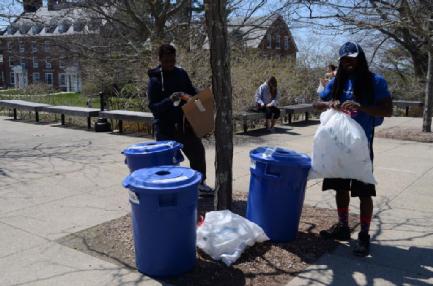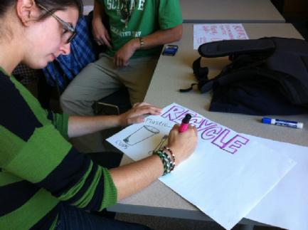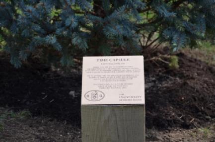 A group of students from Engineering and Art worked together with the recycled plastic collected on campus. The aim was to find out if it is posssible to use this plastic for 3d printing. Several meetings in the Engineering and Sculpture Lab took place. They showed the complexity of working with Polypropylene. Engineering students Jon, Hunter and Rachel constructed a Filastruder and winder to extrude filaments from the collected plastic. The first test worked well. The extruder made approximately 80 grams of rough test filament. Even though it was not pure enough for printing, it was great to see how we can produce our own filaments. Jon and Hunter even experimented succesfully with different colors. In the next step the plastic was granulated. There was extruded a filament with 95 % Polypropylene and added 5% of the recycled plastic. The filament appeared to be irregular, stiff and easily breakable. Unfortunately it is not useable for 3d printing. There are too many additives. Prof. Manbir Sodhi from the Engineering Department planned to continue experimenting with the recycled plastic. Another aim of the activities ist to provide information on sustainable life and to preserve ideas and items for upcoming generations. Therefore a time capsule was created. It was handed over to future discoverers during a tree planting on Earth Day 2015. A tree with its annual rings is also a natural time capsule. It provides information for instance on dryness or nutrition. The actual time capsule contains answers to questions given by faculty members and students: “In which social order will we live in the future?" or "What awareness can we contribute to a globalized world with increasing ecological, economic and social changes?”. There are reports from various faculties, ideas and visions by students. Also there are seeds of an endangered wildflower species from Rhode Island. The time capsule contains as well small objects like an unrecyclable styrofoam cup as a symbol of the end of the carbon age. The future in a human life is predictable and imaginable only for a short term. The live span of the tree is about 100 years. When its natural life ends, the time capsule can be opened.